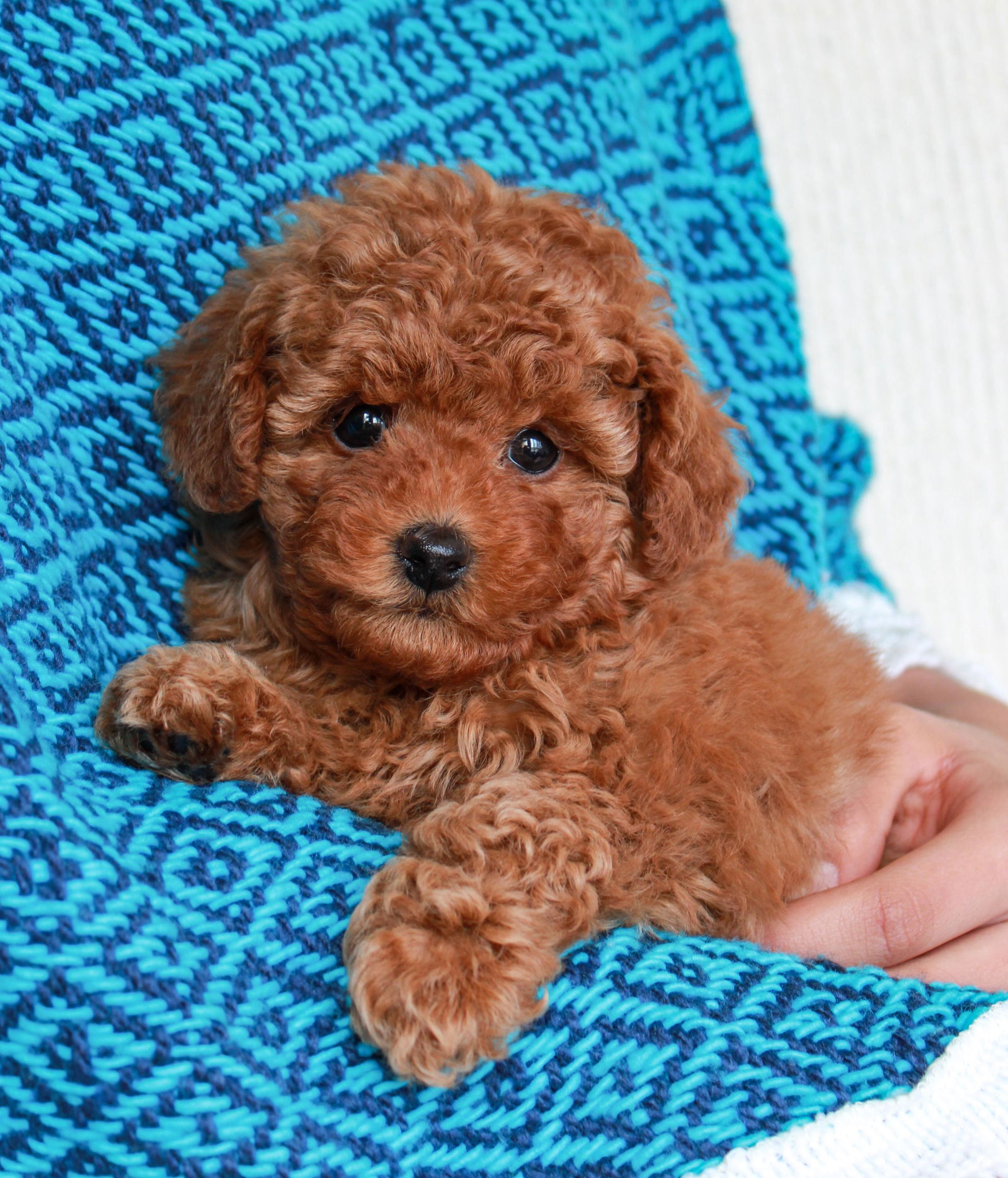 Caspian is tiny, red, and teddy-bear adorable with a soft curly coat. He is confident but gentle, curious yet easygoing, and has a sweet temperament that makes him an easy puppy to love.