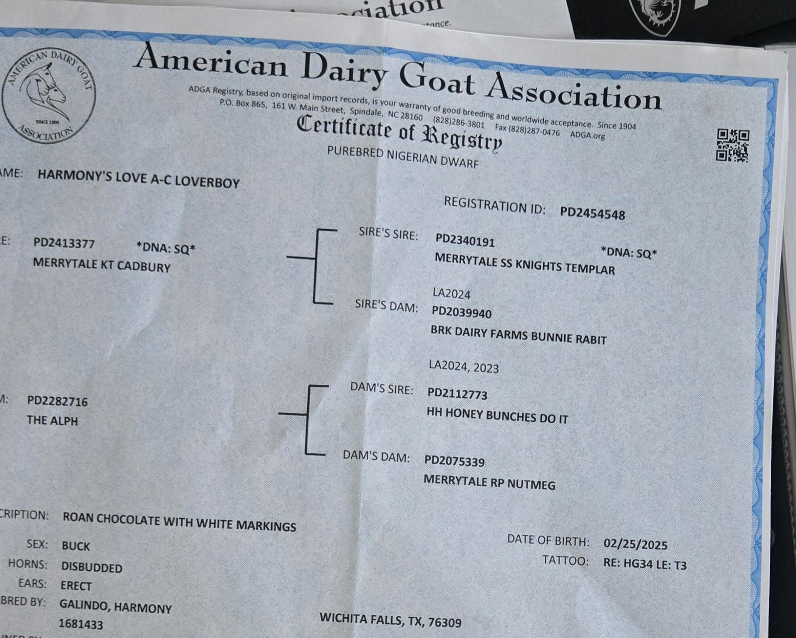 P Pint Size Pastures @pint-size-pastures · Posted by Ginger Jackson · Apr 25 Ginger Jackson added a new Registration record to Loverboy's profile. Registration Apr 25, 2026 View record Registered Name: Harmony's Loclve A-C LoverboyRegistry Association: American Dairy Goat AssociationRegistration Number: PD 2454548