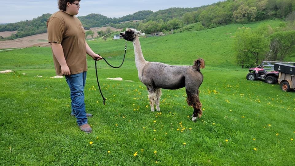 SRLL Novation, affectionately known as Peanut, was one of the first three llamas brought to our farm. She is on the shorter side and has proven herself as a reliable dam over the years. While she can be a bit reserved at first, she settles in nicely once haltered and becomes friendly and easy to work with.