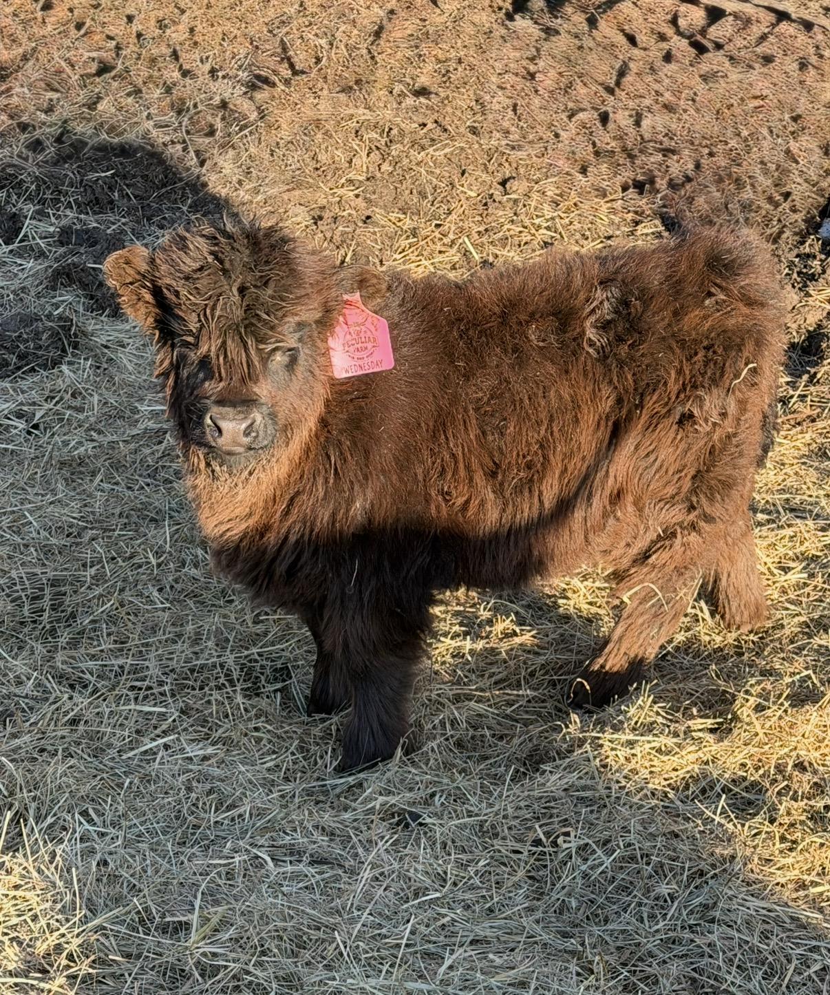 Super tiny beautiful solid black miniature highland heifer calf! Suspected chondro positive awaiting test results, mother raised and will be available once weaned. Born 11-15-25 out of Gabriella & sire dna pending as well